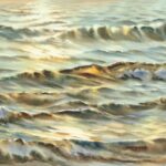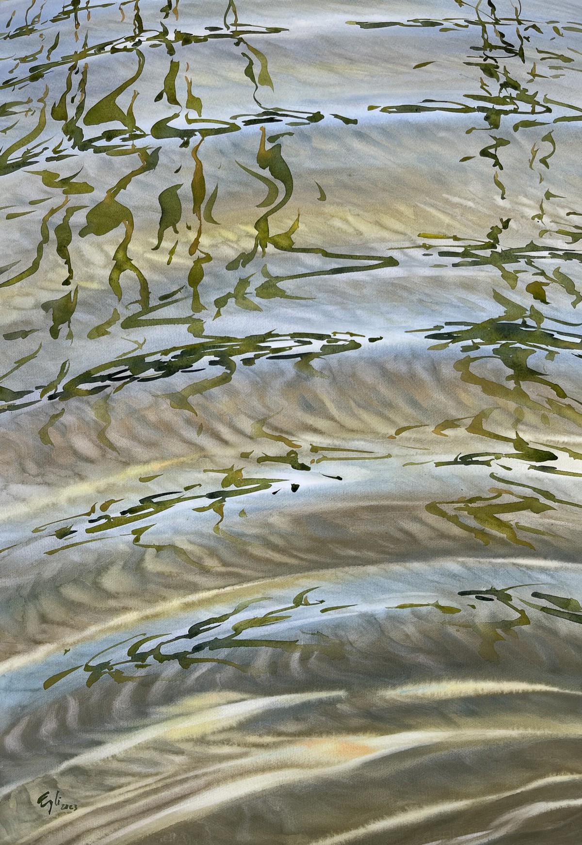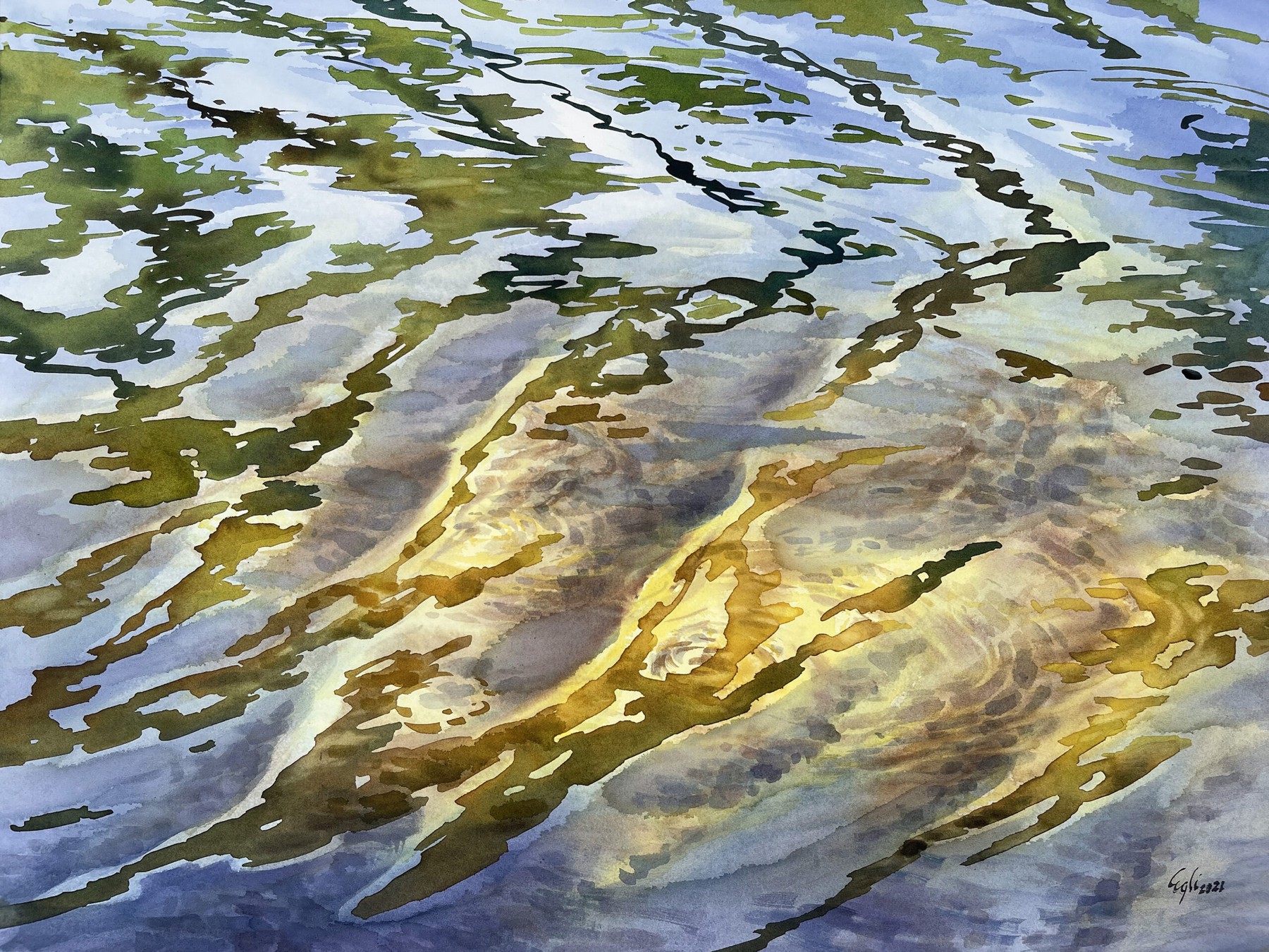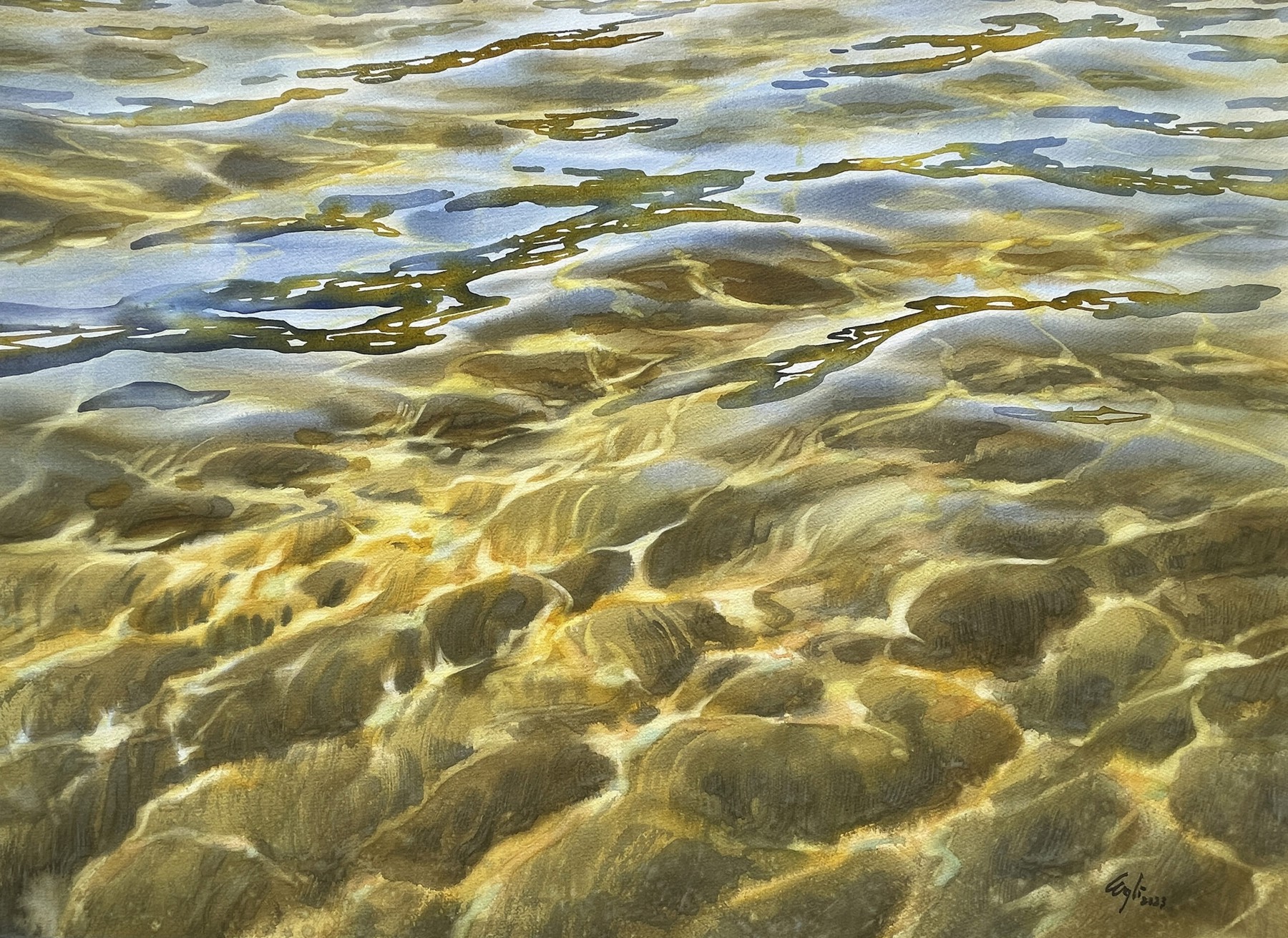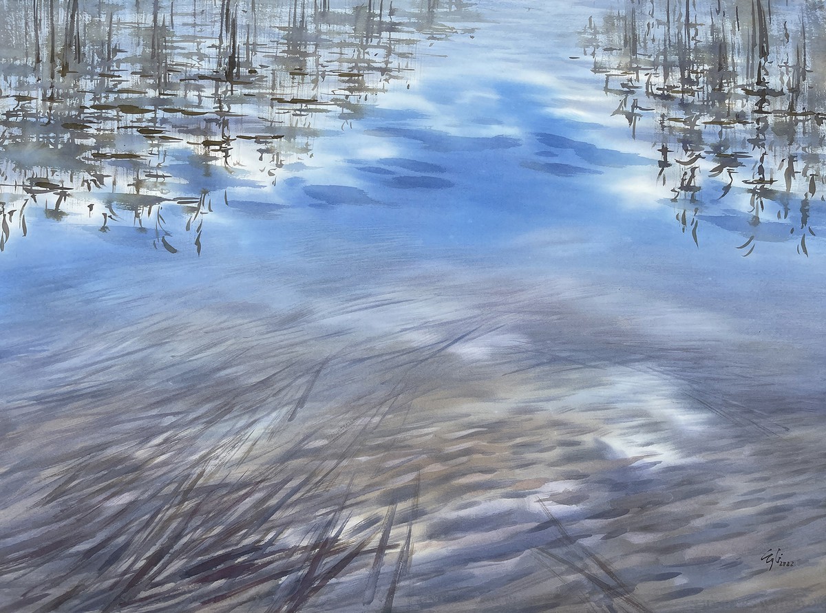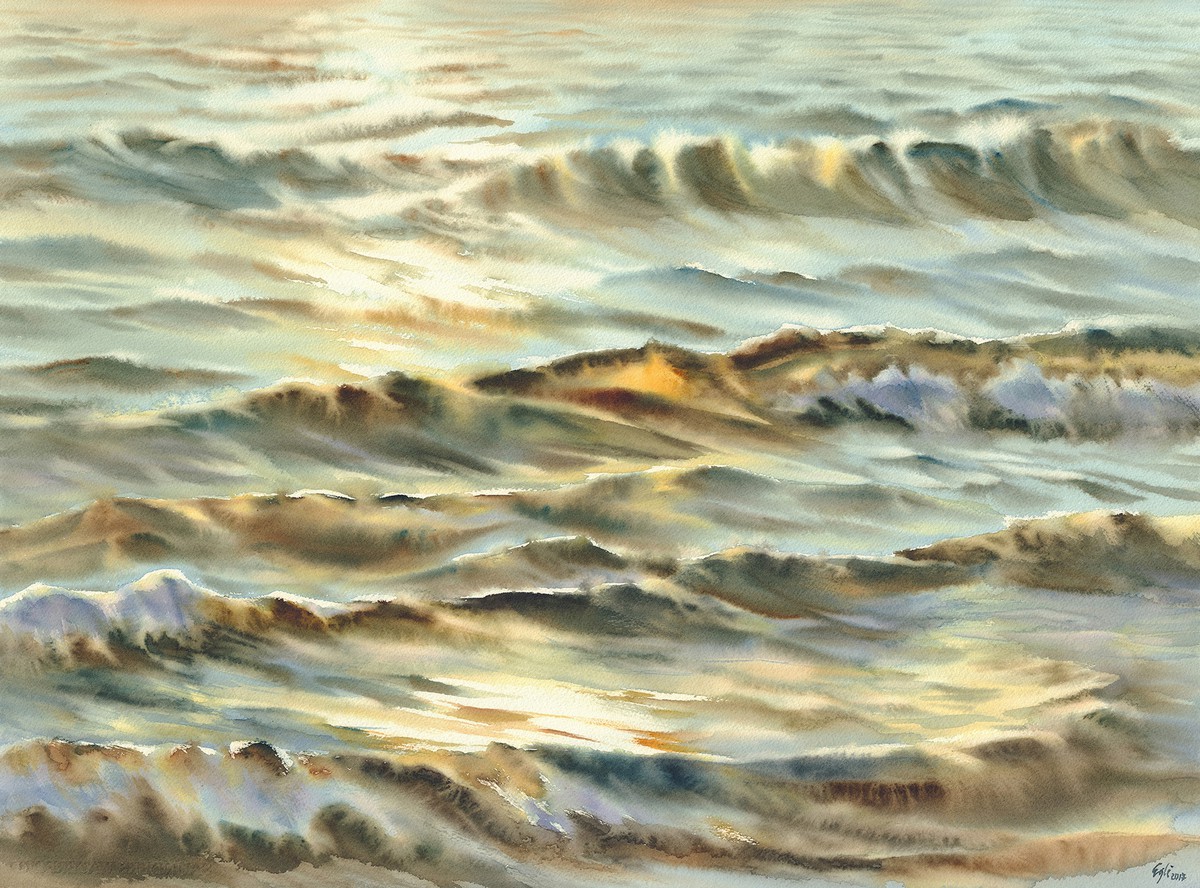 Ve ideas creativas universales en el agua. Combina la luz fría del cielo, el cuerpo cálido de la tierra, los colores de la profundidad del agua, el ritmo de las olas y las líneas del sol en el fondo. Cuando pinta, siente que está dirigiendo una orquesta, donde la música saldrá de la acuarela.