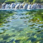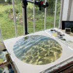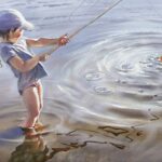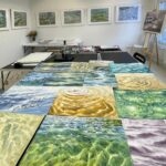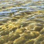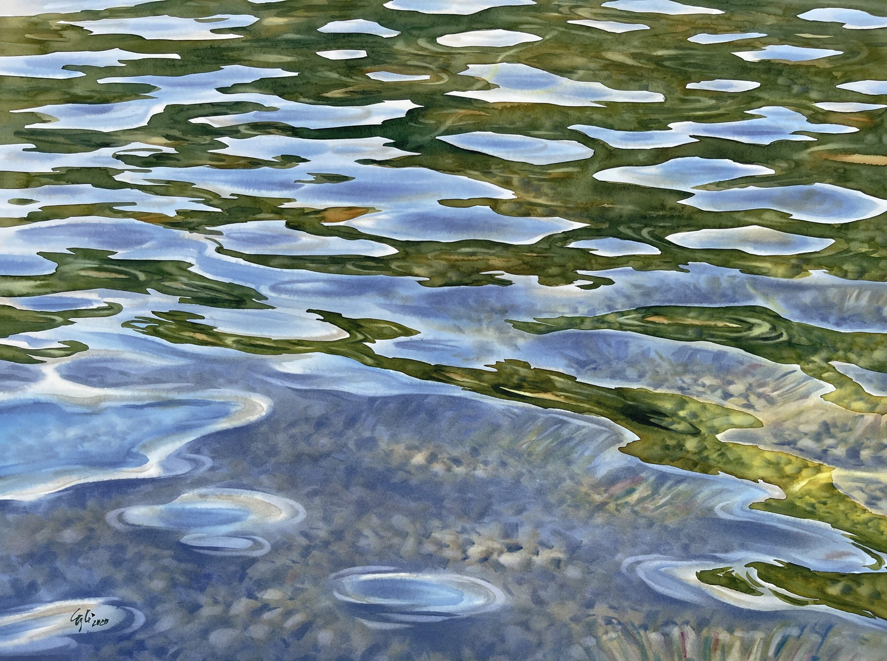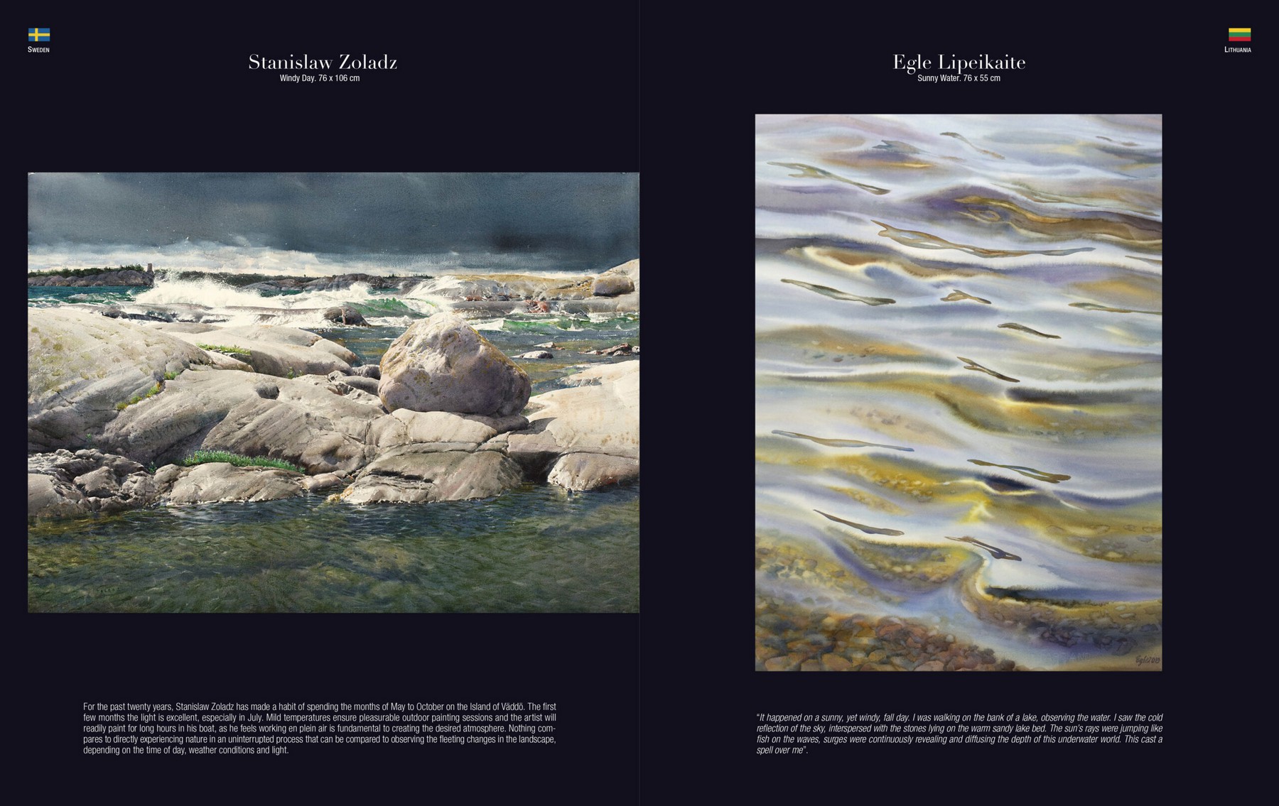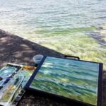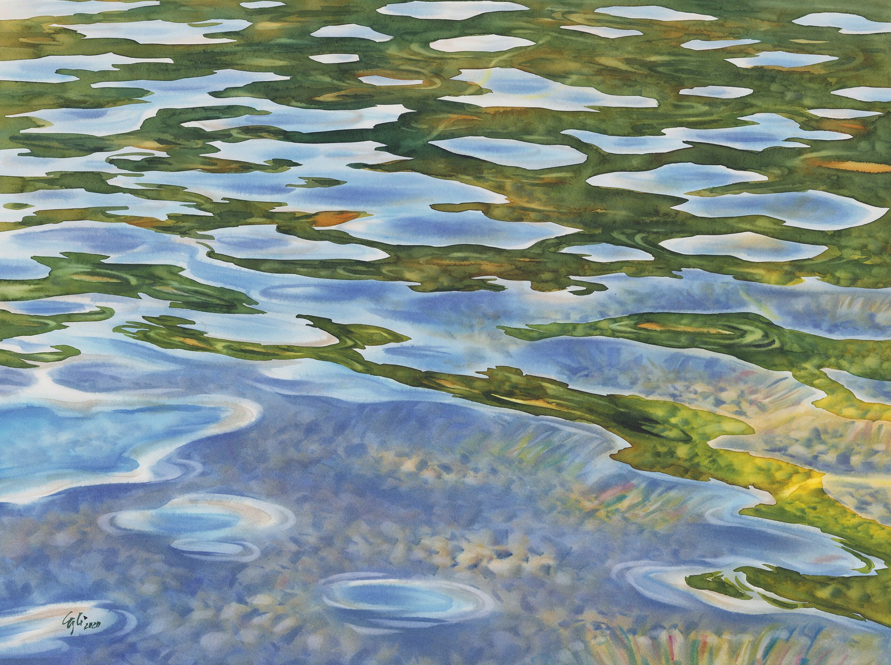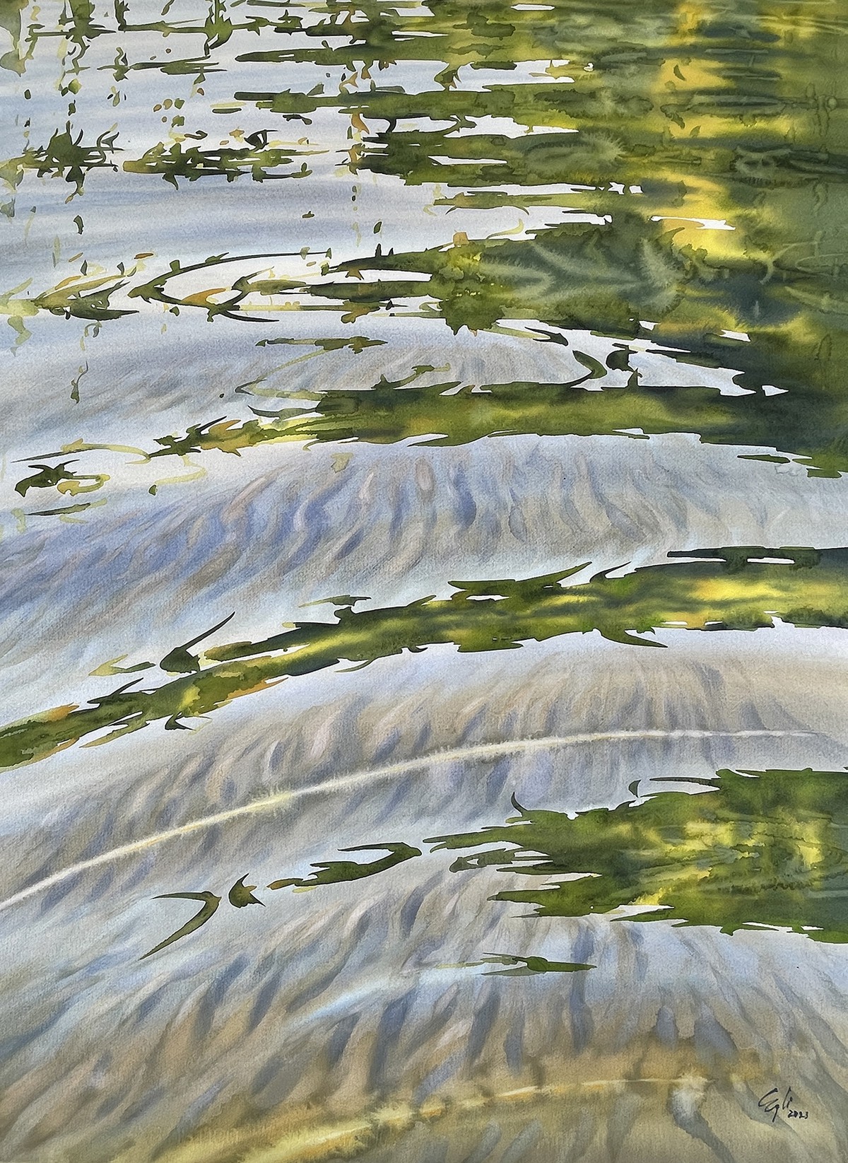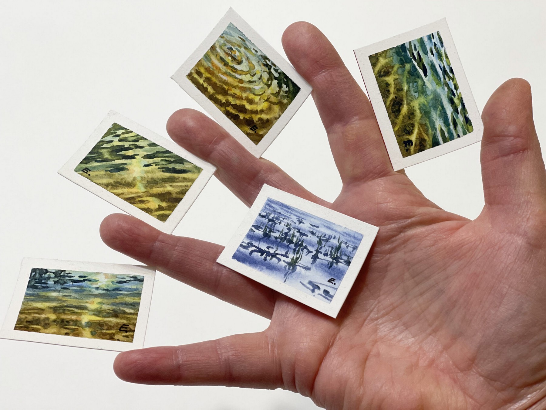 Ve ideas creativas universales en el agua. Combina la luz fría del cielo, el cuerpo cálido de la tierra, los colores de la profundidad del agua, el ritmo de las olas y las líneas del sol en el fondo. Cuando pinta, siente que está dirigiendo una orquesta, donde la música saldrá de la acuarela.