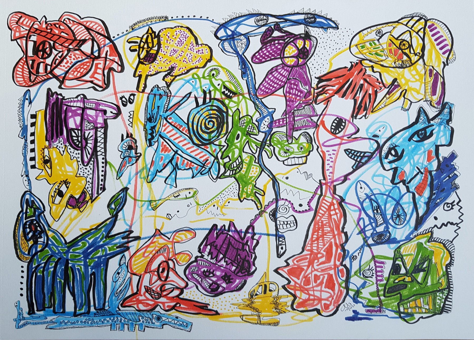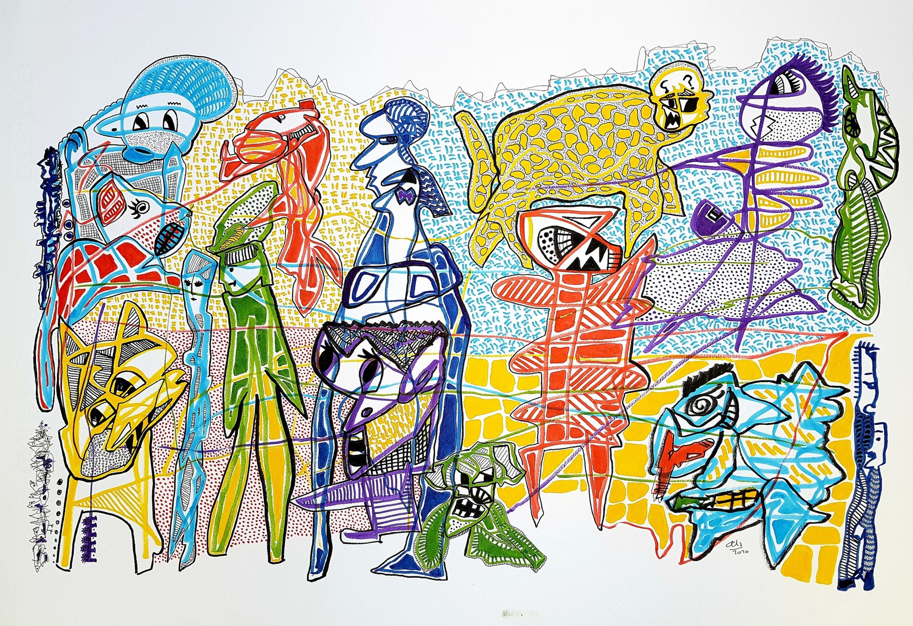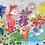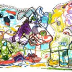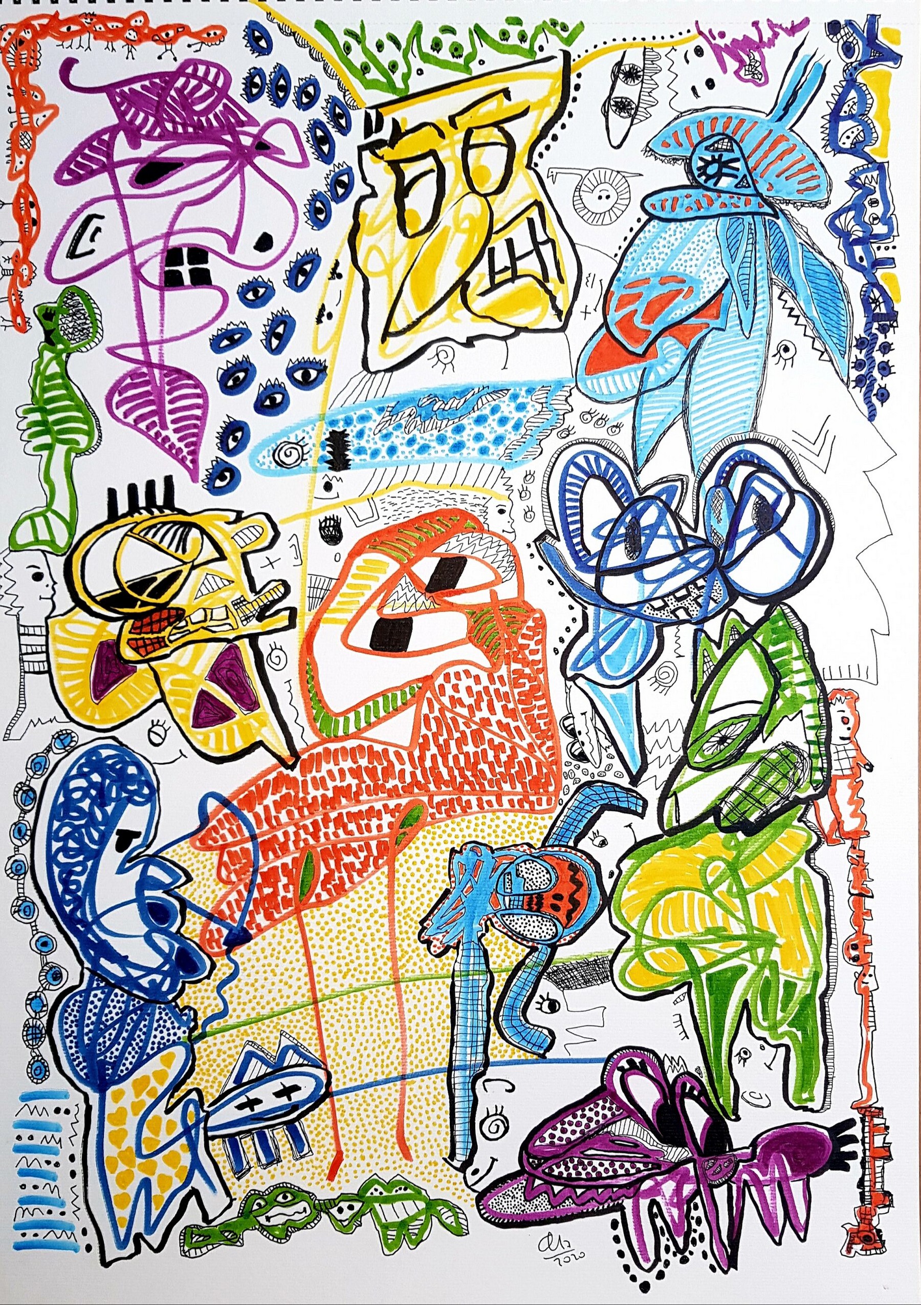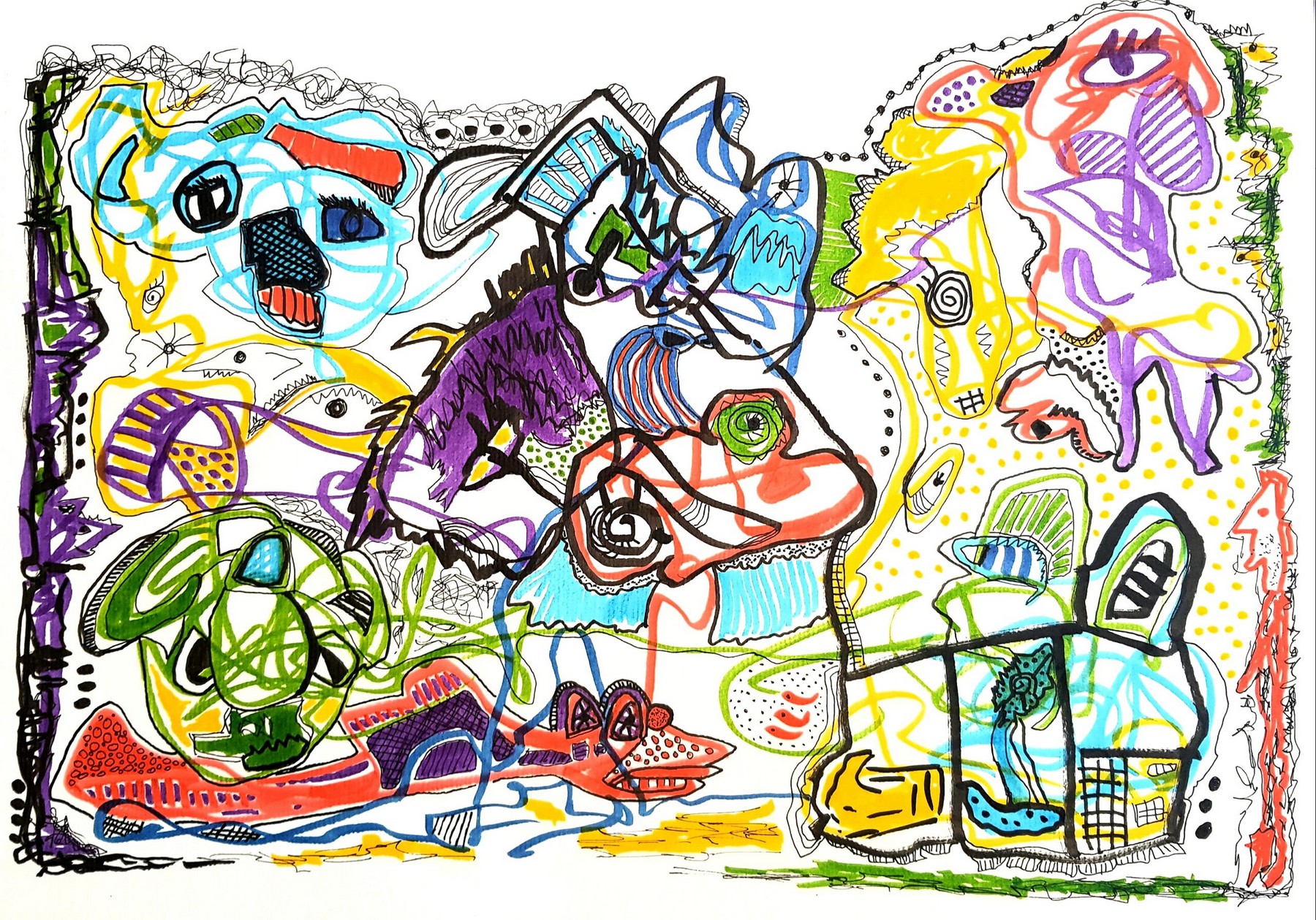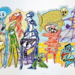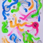 Otras veces, a partir de trazos muy sencillos pinta personajes en ellos.