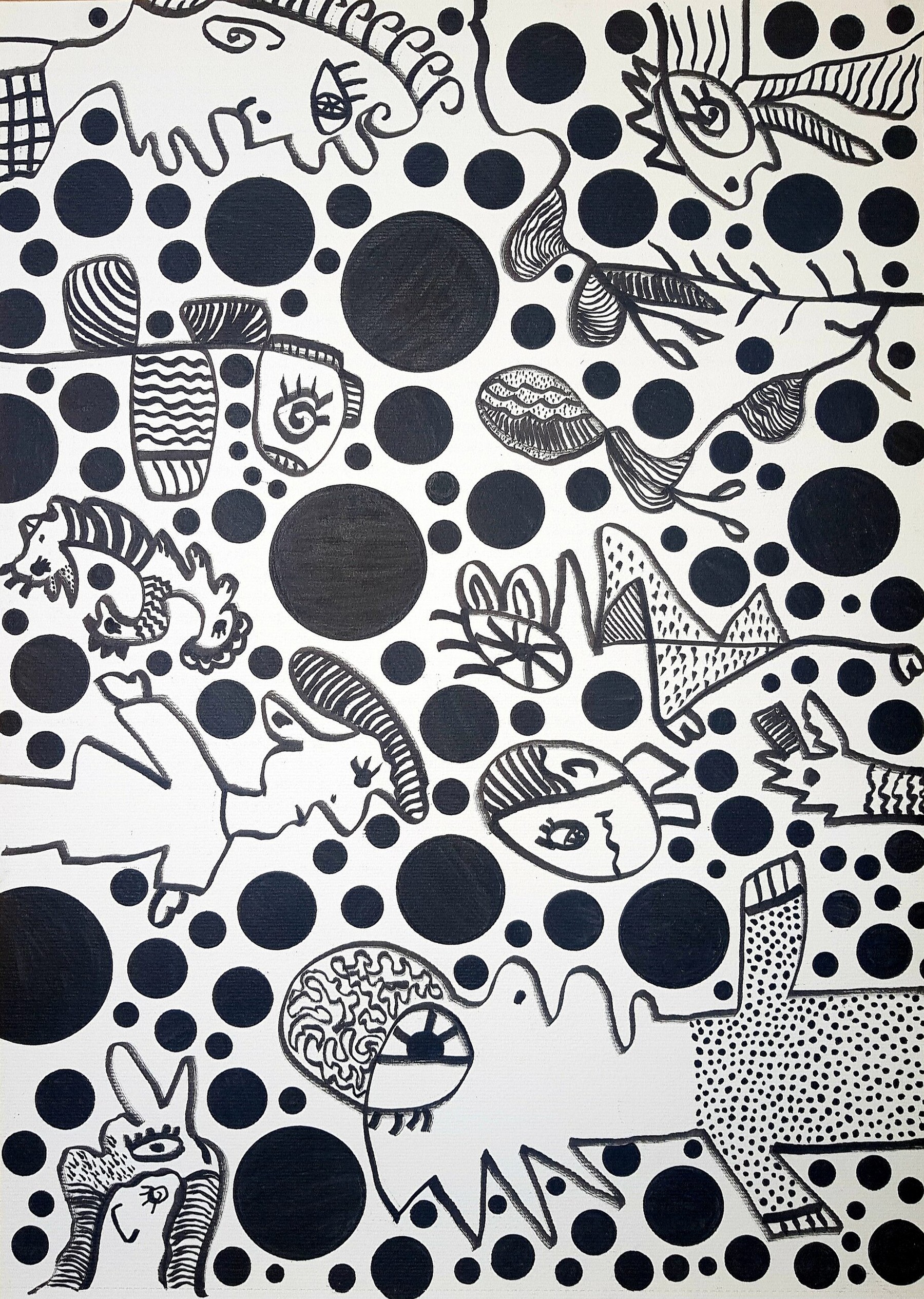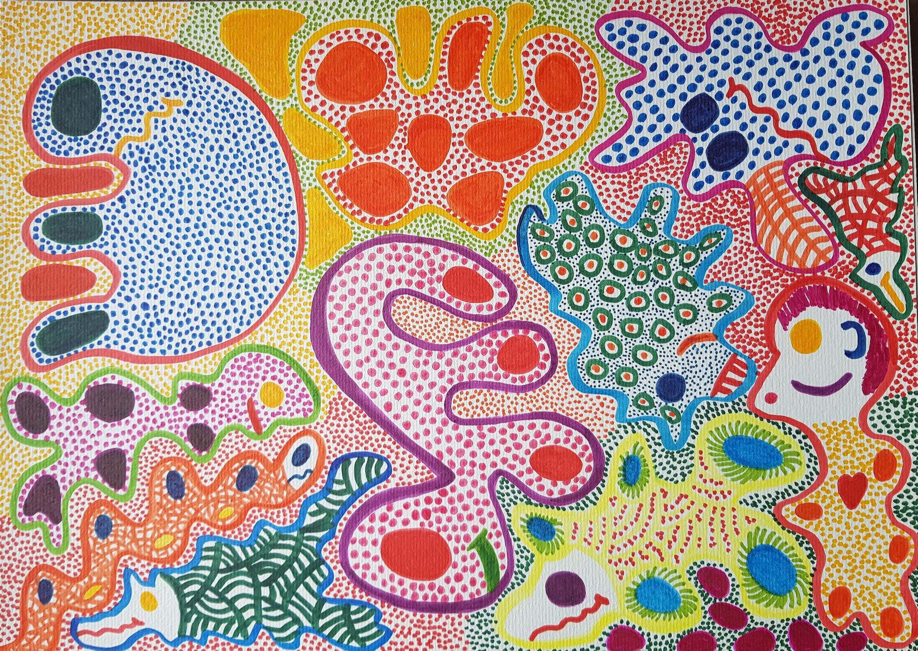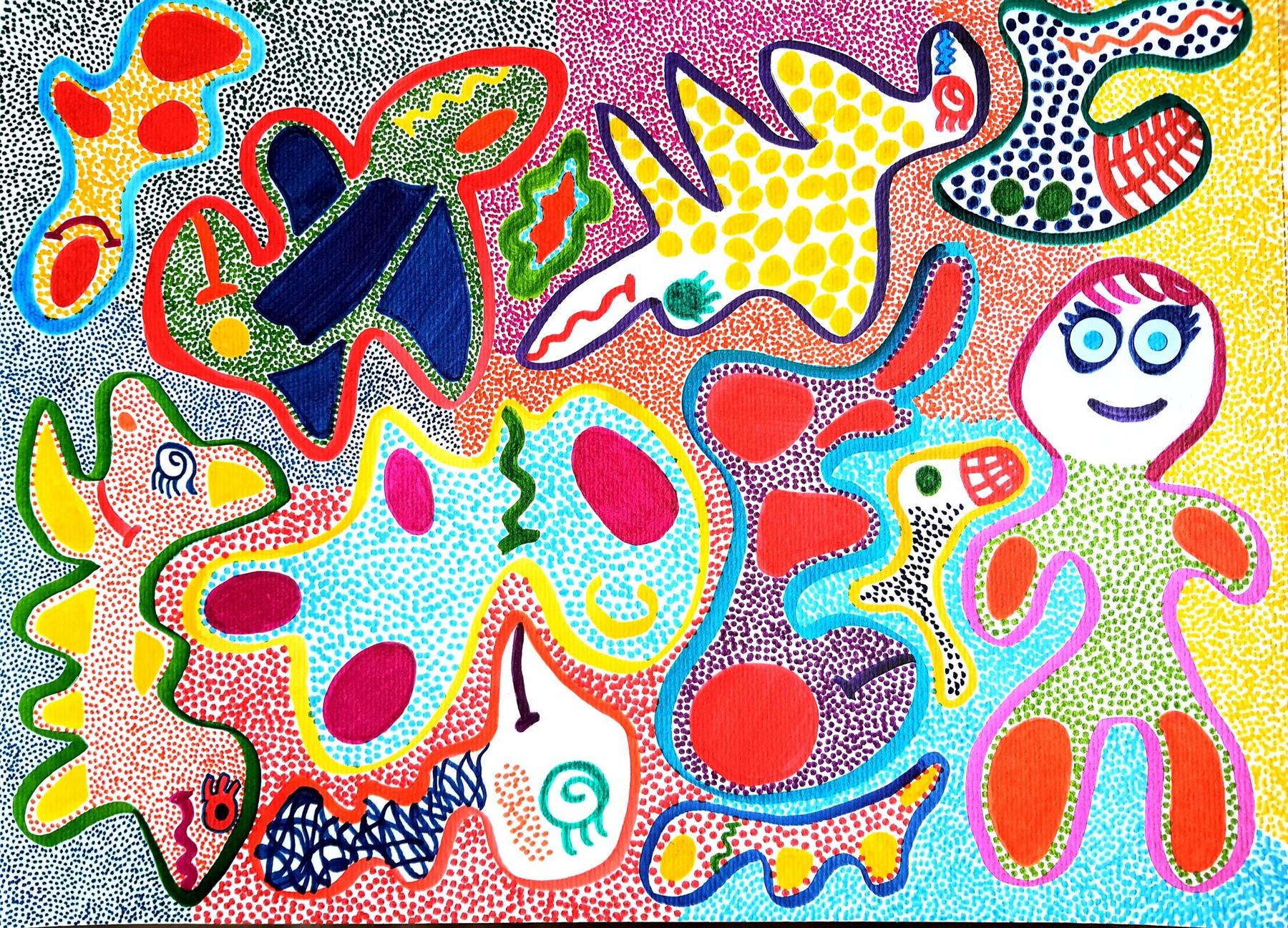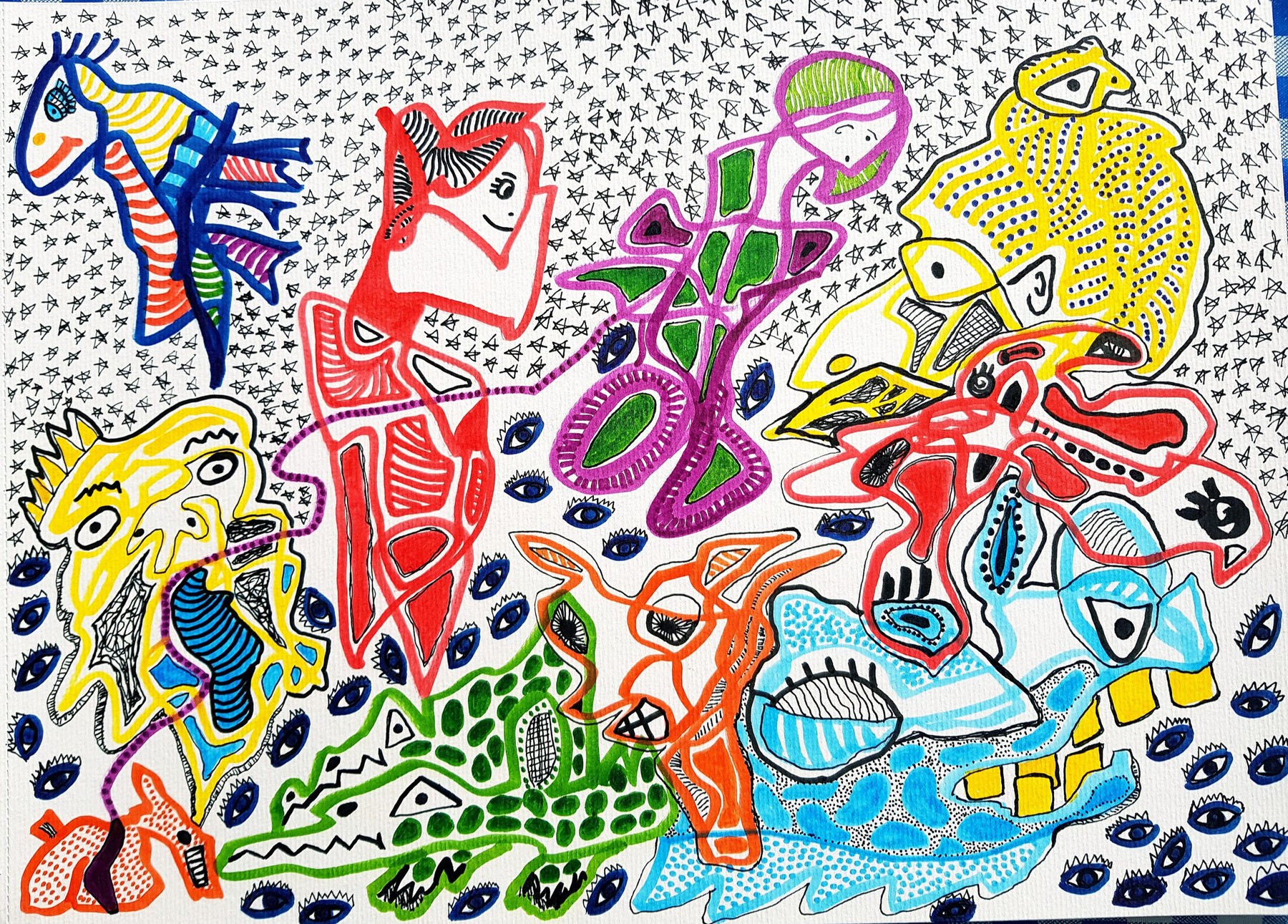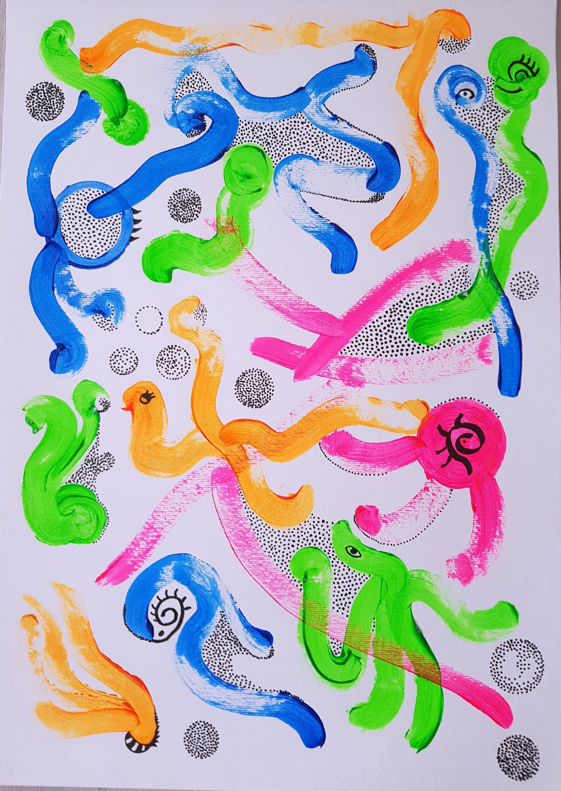 Otras veces, a partir de trazos muy sencillos pinta personajes en ellos.