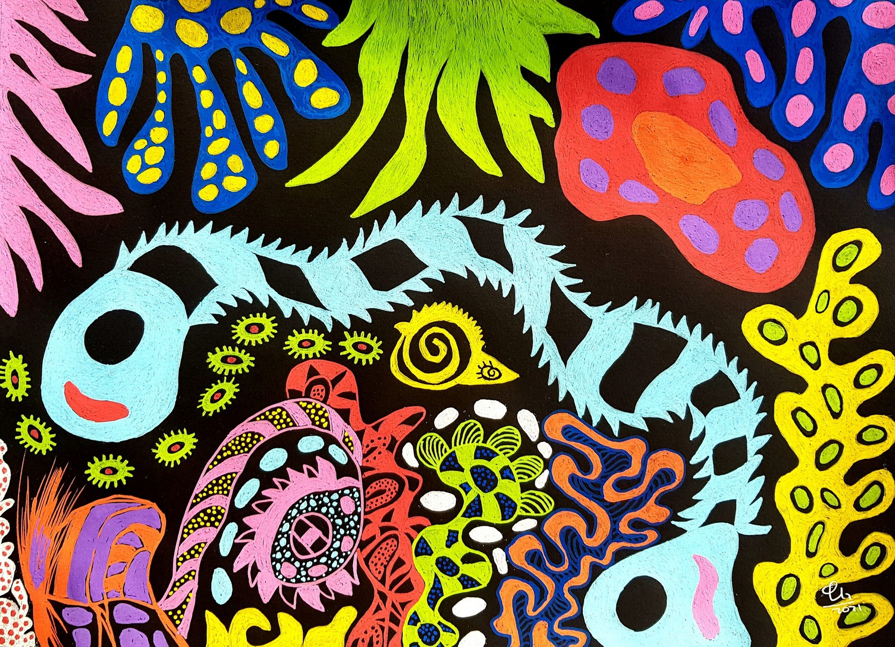 Le gusta experimentar con nuevas formas de expresión: recortar para dar volumen, hacer reservas de blancos para después pintar en ellos personajes y objetos divertidos, que nos hagan hacernos preguntas.